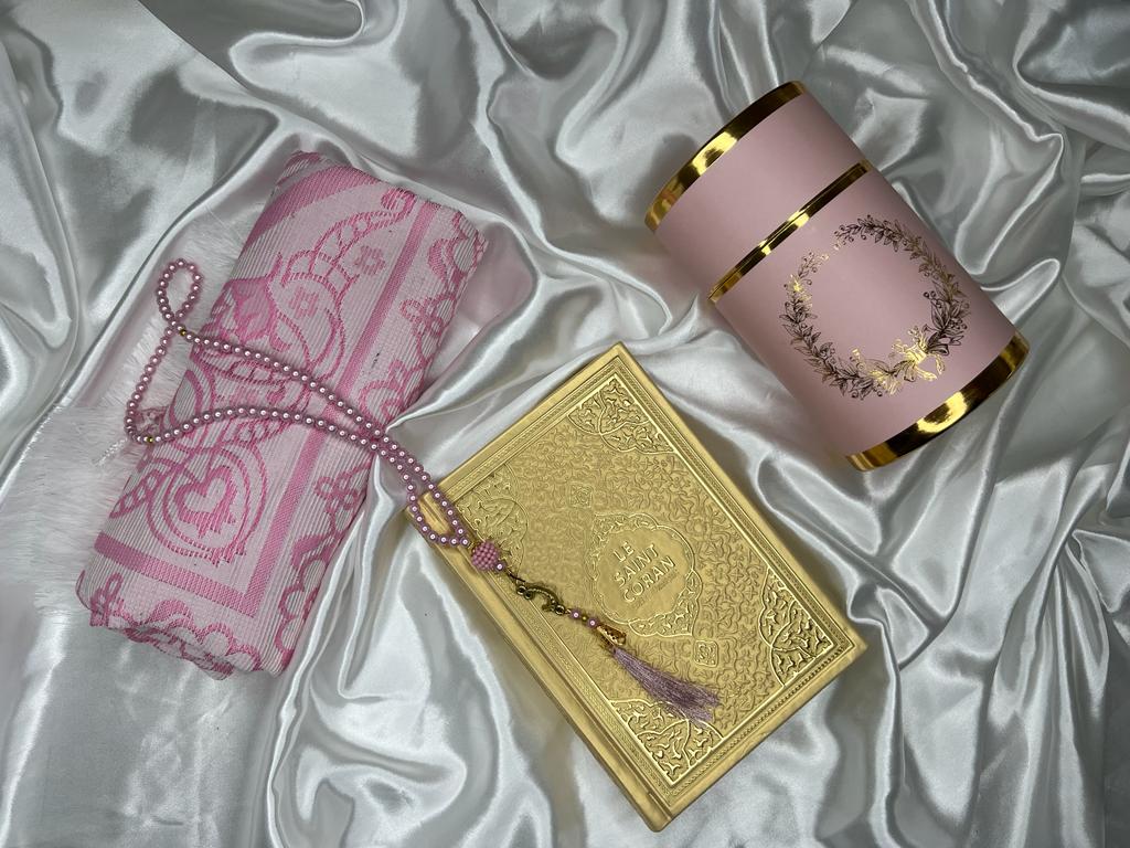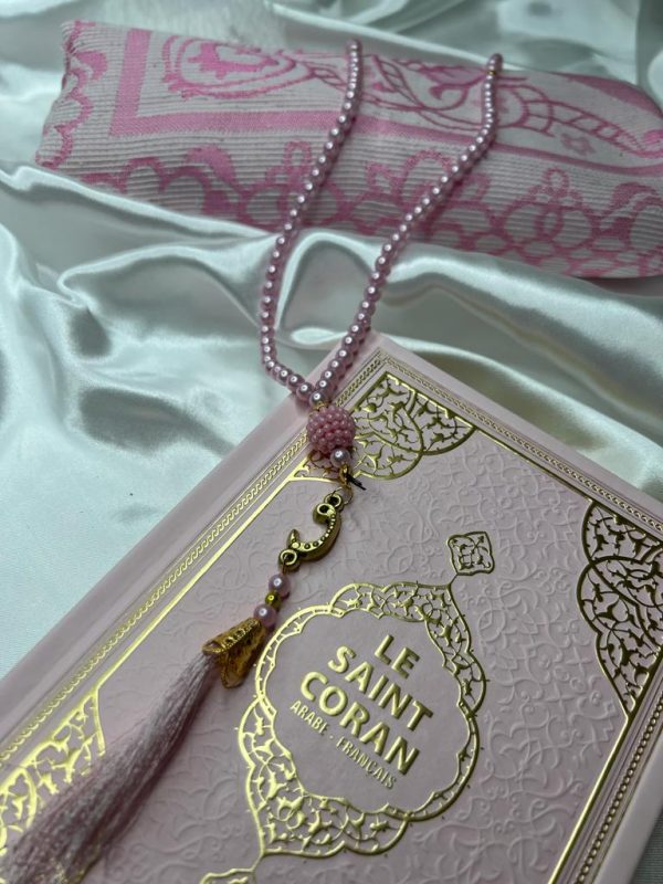 Pack boîte tapis de prière, tasbih décoratif et coran – Rose et Doré